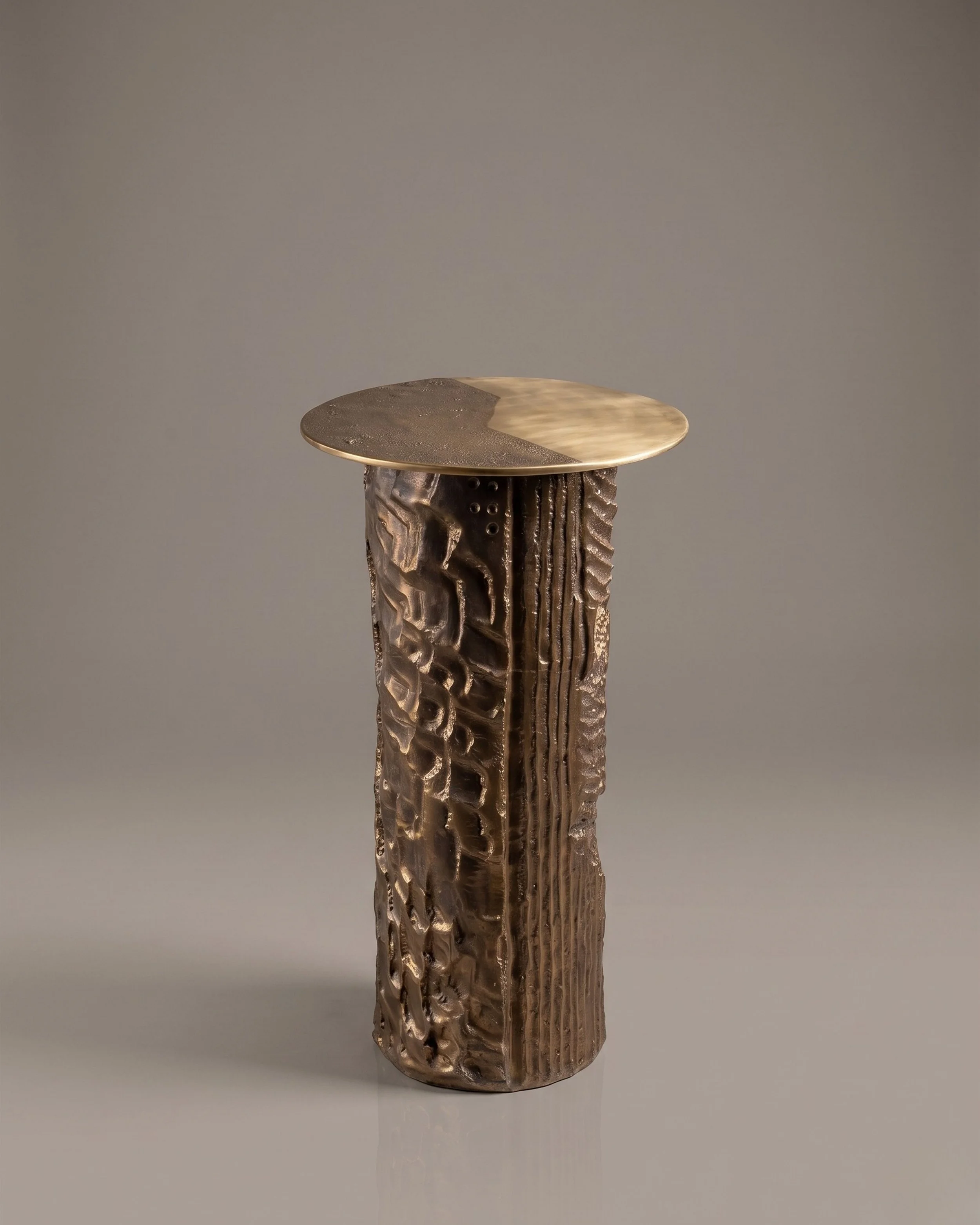 Finished in a rich gold patina, the form carries depth and variation—shifting subtly as it catches light. Paired with a brass top, the piece creates a quiet dialogue between reflection and shadow, rawness and refinement.